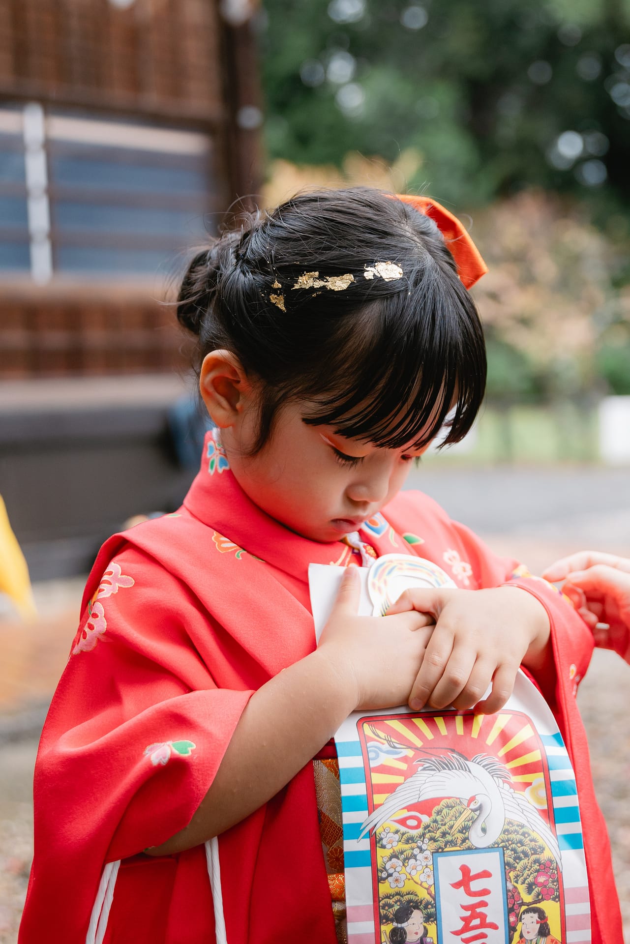 ご祈祷後にもらった千歳飴と袋をどうしても自分で持ちたくて、両手でぎゅっと抱えて離さない。
